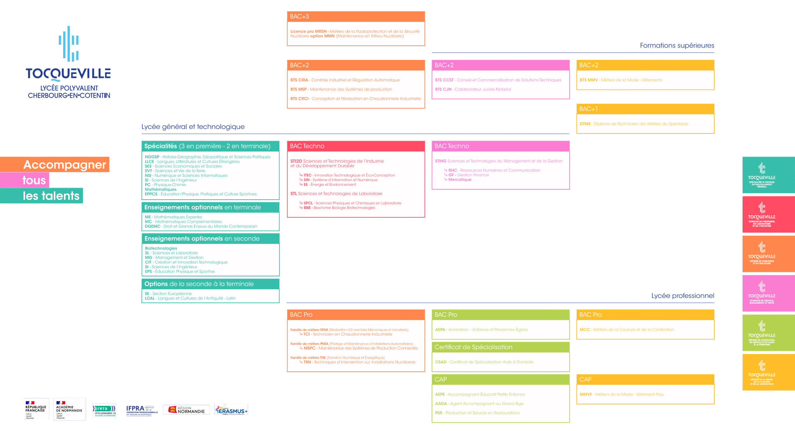 Le lycée Alexis de Tocqueville propose un large éventail de formations, de la Seconde aux licences professionnelles, en passant par des BTS et des formations en alternance. Découvrez comment intégrer nos formations selon votre niveau d’études.