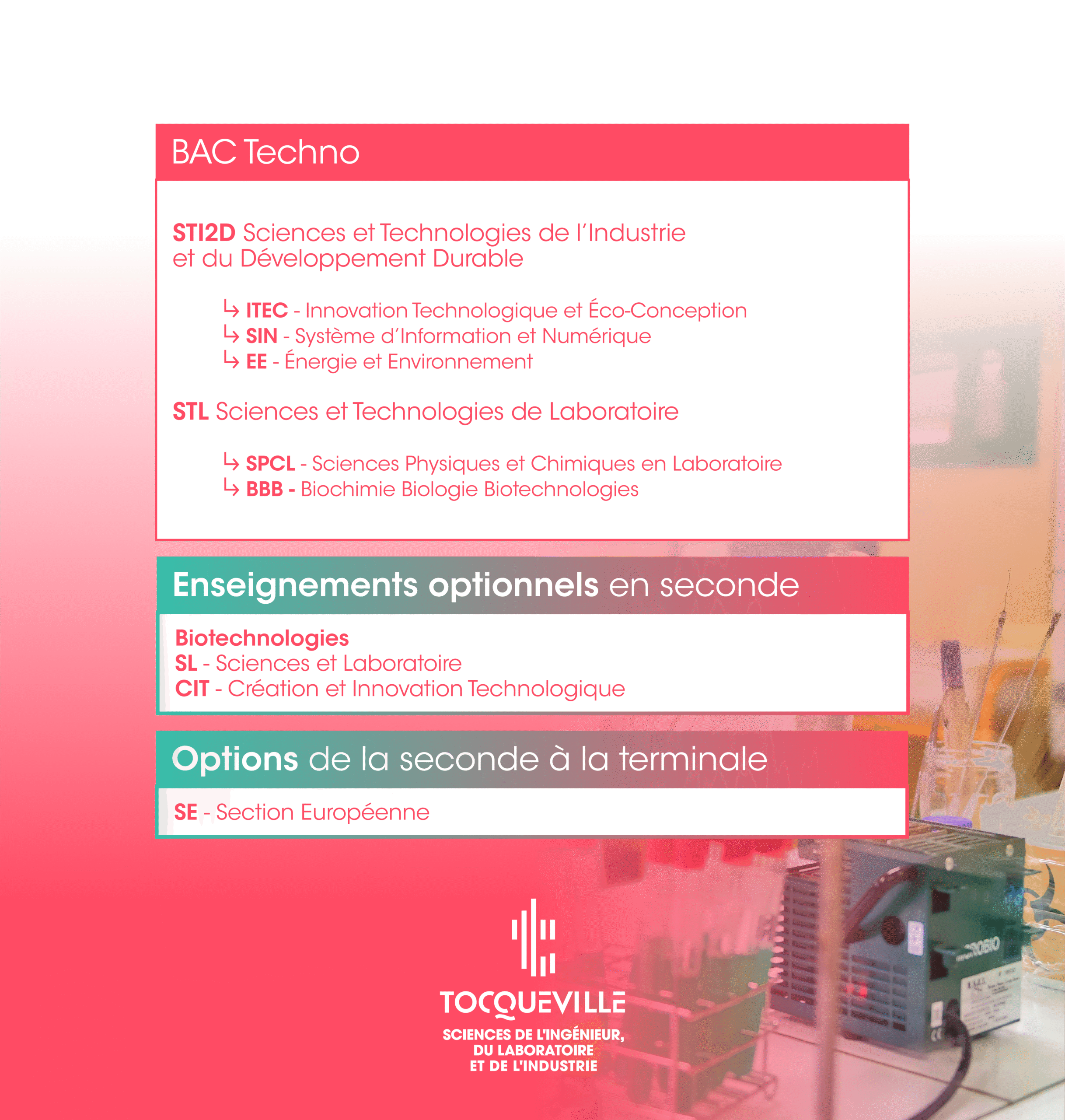 BAC Techno STI2D Sciences et Technologies de l’Industrie et du Développement Durable ITEC – Innovation Technologique et Éco-Conception SIN – Système d’Information et Numérique EE – Énergie et Environnement STL Sciences et Technologies de Laboratoire SPCL – Sciences Physiques et Chimiques en Laboratoire BBB – Biochimie Biologie Biotechnologies e BBB – Biochimie Biologie BiotechnologiesBAC GénéralSI – Sciences de l’Ingénieur SCIENCES DE L’INGÉNIEUR,DU LABORATOIRE ET DE L’INDUSTRIE