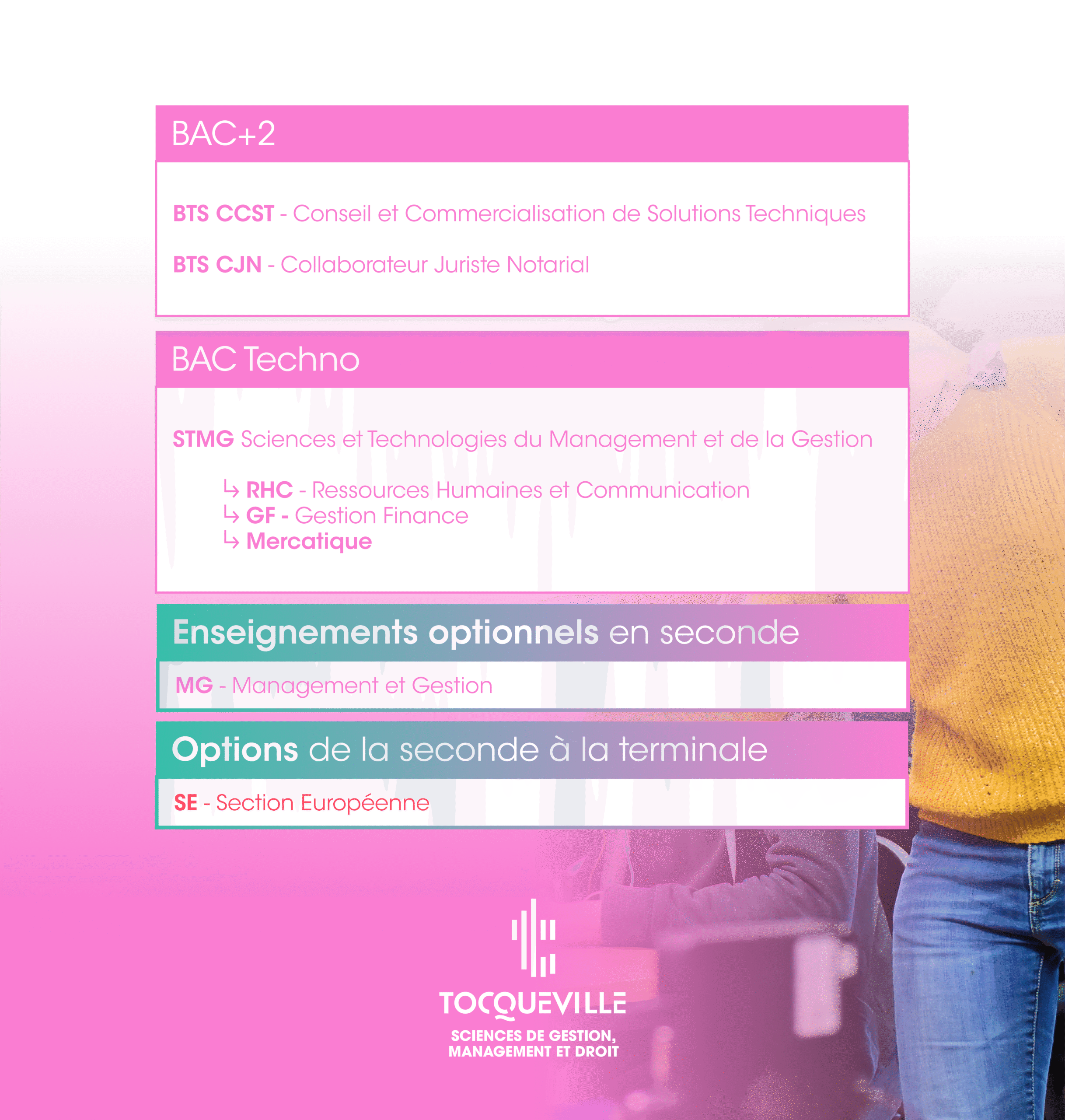BAC+2 BTS CCST - Conseil et Commercialisation de Solutions Techniques BTS CJN - Collaborateur Juriste Notarial BAC Techno STMG Sciences et Technologies du Management et de la Gestion RHC - Ressources Humaines et Communication GF - Gestion Finance Mercatique SCIENCES DE GESTION,MANAGEMENT ET DROIT