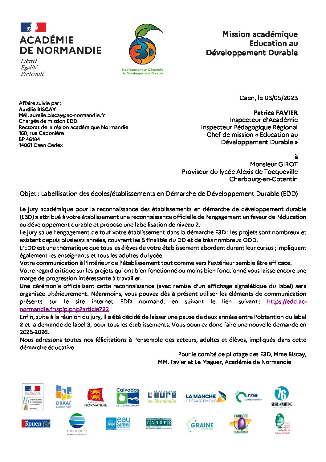 Courrier Labellisation Lycee Tocqueville