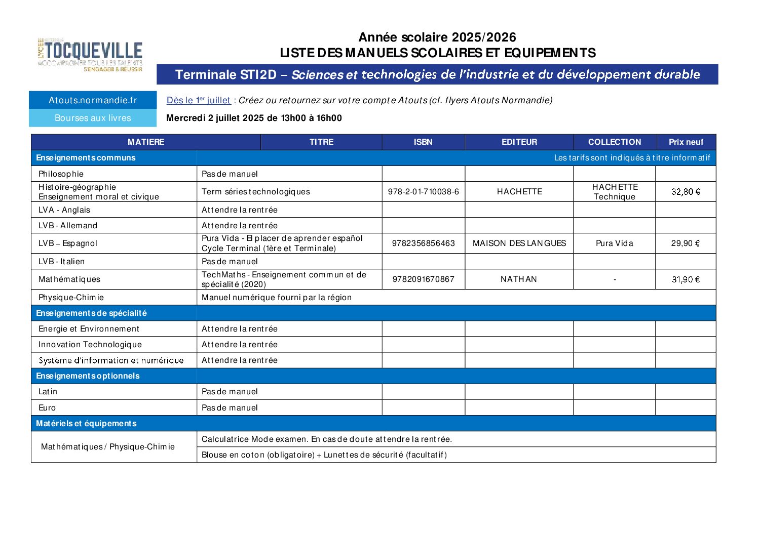 LISTE DES MANUELS SCOLAIRES – RENTREE 2025-2026 – SECTIONS PRO